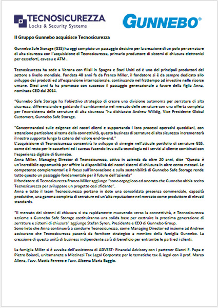 Il Gruppo Gunnebo acquisisce Tecnosicurezza